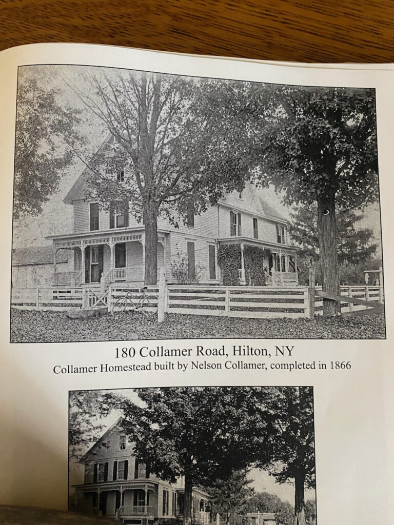 They had heard of the rich plains bordering the southern shore of Lake Ontario. Their first farm was located on the south side of Curtis Road, near Braddock Bay. Unfortunately, mosquitoes infested the area in the summertime, and Hannah contracted Malaria. Soon after, they relocated inland to a farm on a road that was later named Collamer Road after them. The family has lived there for several generations, and the old homestead still stands at 180 Collamer Road. It is now owned by Mr. and Mrs. Cameron Knaub who are restoring the home.