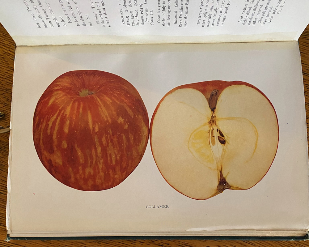 John planted many apple varieties, but the one that the family became famous for was the Twenty Ounce apple, which later was perfected into the Collamer Apple and is featured on page 37 in Volume 2 of Apples of New York, published by Cornell University in 1905. The Collamer was a very large apple with a pink blush that made great pies and applesauce.