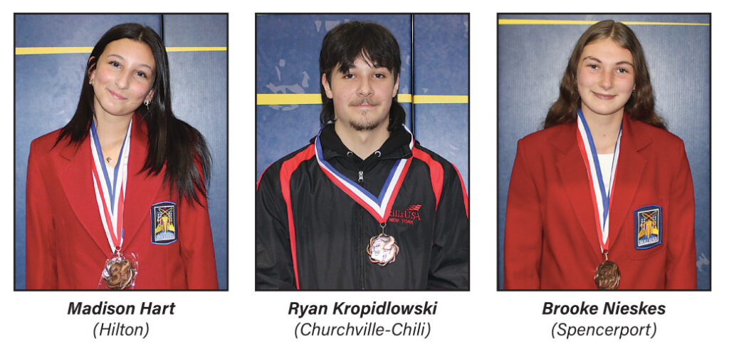 Individual third-place finishes were earned by three BOCES 2 CTE students: Nurse Assisting and Associated Health Careers student Madison Hart (Hilton) in Prepared Speech, Residential and Commercial Electrical student Ryan Kropidlowski (Churchville-Chili) in Electrical Construction Wiring, and Medical Laboratory Assisting and Phlebotomy student Brooke Nieskes (Spencerport) in Action Skills Basic.