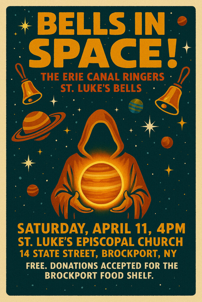The Erie Canal Ringers invite the community to experience “Bells in Space,” a free concert inspired by the wonder of the universe, on Saturday, April 11, at 4 p.m. at St. Luke’s Episcopal Church, 14 State Street, Brockport.