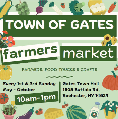 Town of Gates Farmers Market is held the first and third Sunday of the month (May through October) from 10 a.m. to 1 p.m. at the Gates Town Hall, 1605 Buffalo Road, Rochester. Features farmers, food trucks, and crafts.