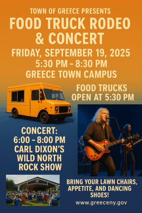 All are invited to attend a concert and food truck rodeo on Friday, September 19, from 5:30 to 8:30 p.m. at the Greece Town Campus. The concert that evening will feature Carl Dixon’s Wild North Rock Show.