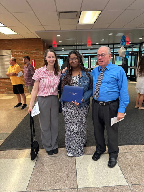 The Brockport Kiwanis Club awarded its annual George Mann scholarship to senior Madison Howard (center) at the High School senior scholarship night on June 5. Presenting the award were club member Betsy Stull (left), who oversaw much of the scholarship application and award process, and Jeff Fisher (right), incoming President of the Brockport Kiwanis Club. Presentation of the cash award to Madison will occur at a regularly scheduled club meeting in the near future.