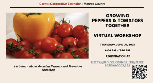 Cornell Extension of Monroe County, in collaboration with Kirby Farm, offers the “Growing Peppers and Tomatoes Together – Virtual Workshop” on Thursday, June 26, from 6 to 7:30 p.m. All aspiring backyard gardeners, homesteaders, community garden members, school garden coordinators, and members of the public who wish to sharpen their gardening skills are invited to join.