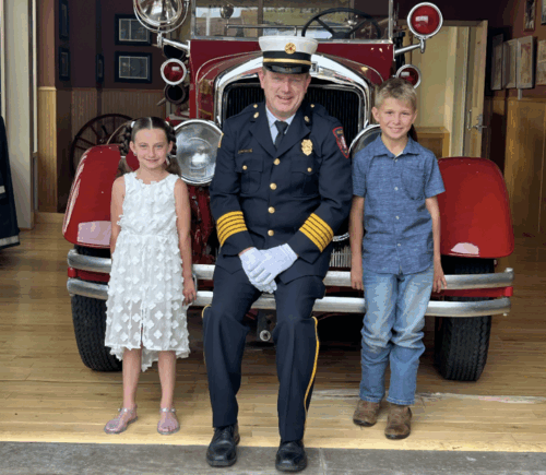 The Hilton Fire Department selected Noah Furtner and Bailey Heinrich, shown with Chief Troy Green, to serve as the 2025 Kiddie King and Queen for the annual fire department parade.