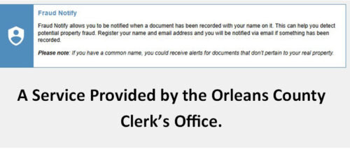 “Recently in the news, there have been plenty of stories of unsuspecting homeowners who had fraudulent deeds filed on their homes and there have been attempts right here in Orleans County,” said Hanlon. “While the Fraud Notify service cannot block any filings, the fact that you are notified instantly allows you to contact law enforcement and get a lawyer to immediately put a stop to it.”