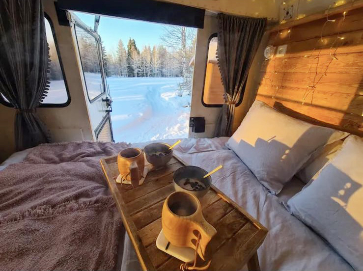 Formerly known as Bus 126, the bright yellow vehicle once transported students throughout Orleans County. These days, the bus—renamed “Kendall” as a nod to the district it once served—sits peacefully on the shores of Lake Miekojärvi, having embarked on an unexpected journey to the heart of Finnish Lapland to be converted into a lakeside retreat.