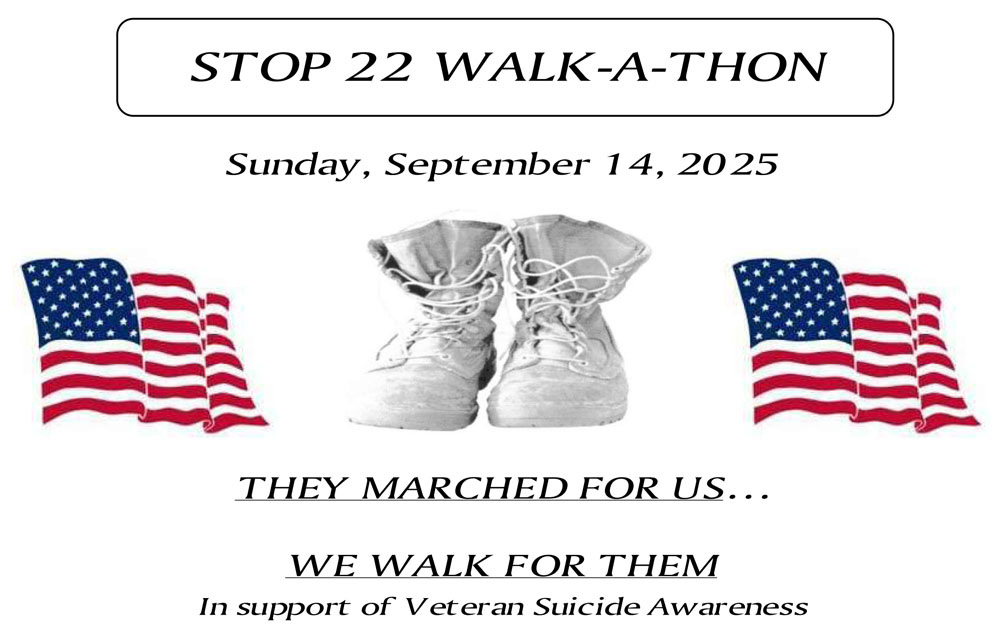 VFW Post 4658 will host a Stop 22 Walkathon on Sunday, September 14, at American Legion Post 468, 344 Dorsey Road, Greece. Stop 22 is an initiative within the Department of New York Veterans of Foreign Wars to increase awareness of veterans lost to suicide – 22 each day. They marched for us… we walk for them.