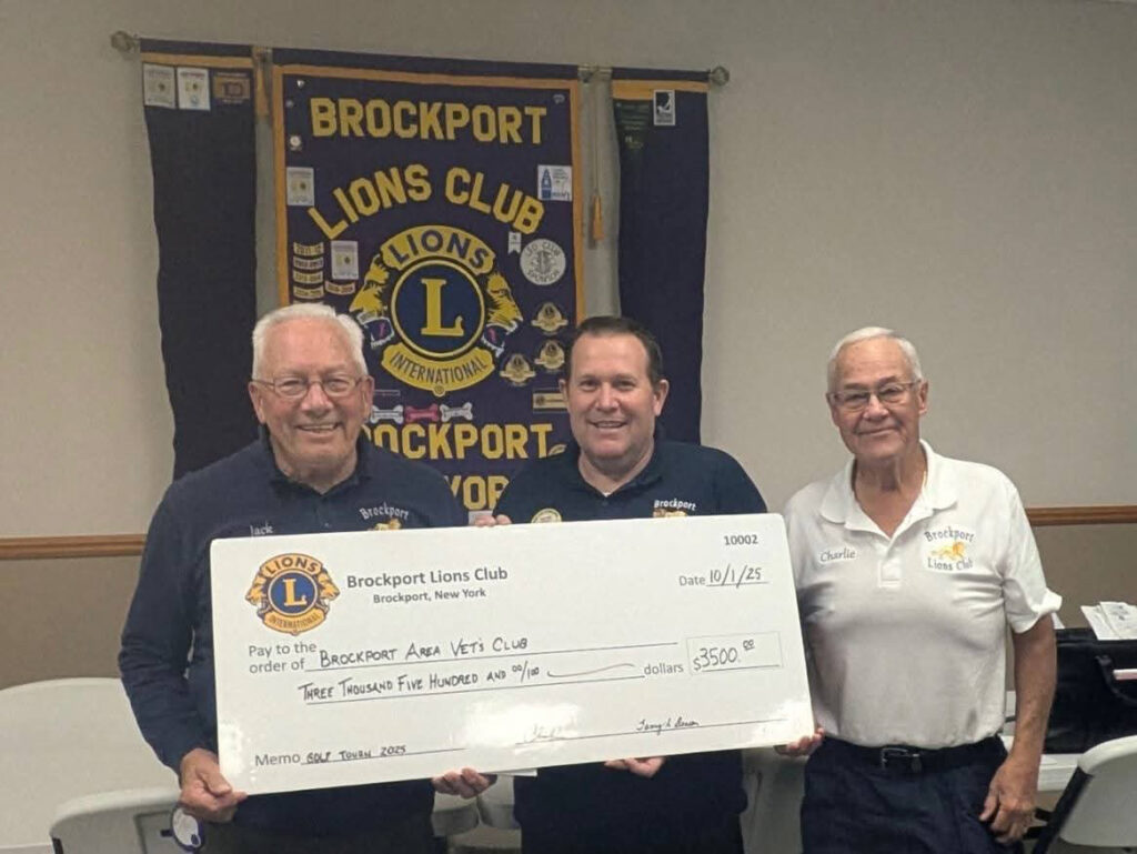 On Wednesday, October 1, the Brockport Lions Club presented a $3,500 check to the Brockport Area Veterans Club. The proceeds were from their golf outing held on September 28. Thanks to all those who participated in support of the Veterans organization. Pictured are (l-r) Jack Tangen, Commander of the Veterans Club; Lion President Kevin Smith; and Lion Treasurer Charlie Deacon. For more information on the Brockport Lions Club, email Greg Lund at lunddargreg@aol.com.