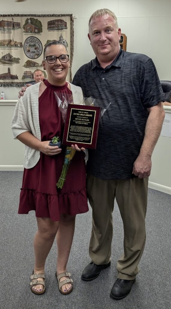 The plaque reads: “This award is given to Keylee in recognition for her commitment and dedication to the Hamlin Recreation Department as the Director of Recreation. She is an amazing asset to the Town with her outstanding communication, work ethic and the desire to always do what is best for the members of our community. She goes above and beyond her job duties to ensure all events are of a huge caliber and successful. It is because of all her leadership and putting all her heart into all she does for the Town of Hamlin that Keylee is presented the Extra Mile Award on October 14, 2025.”