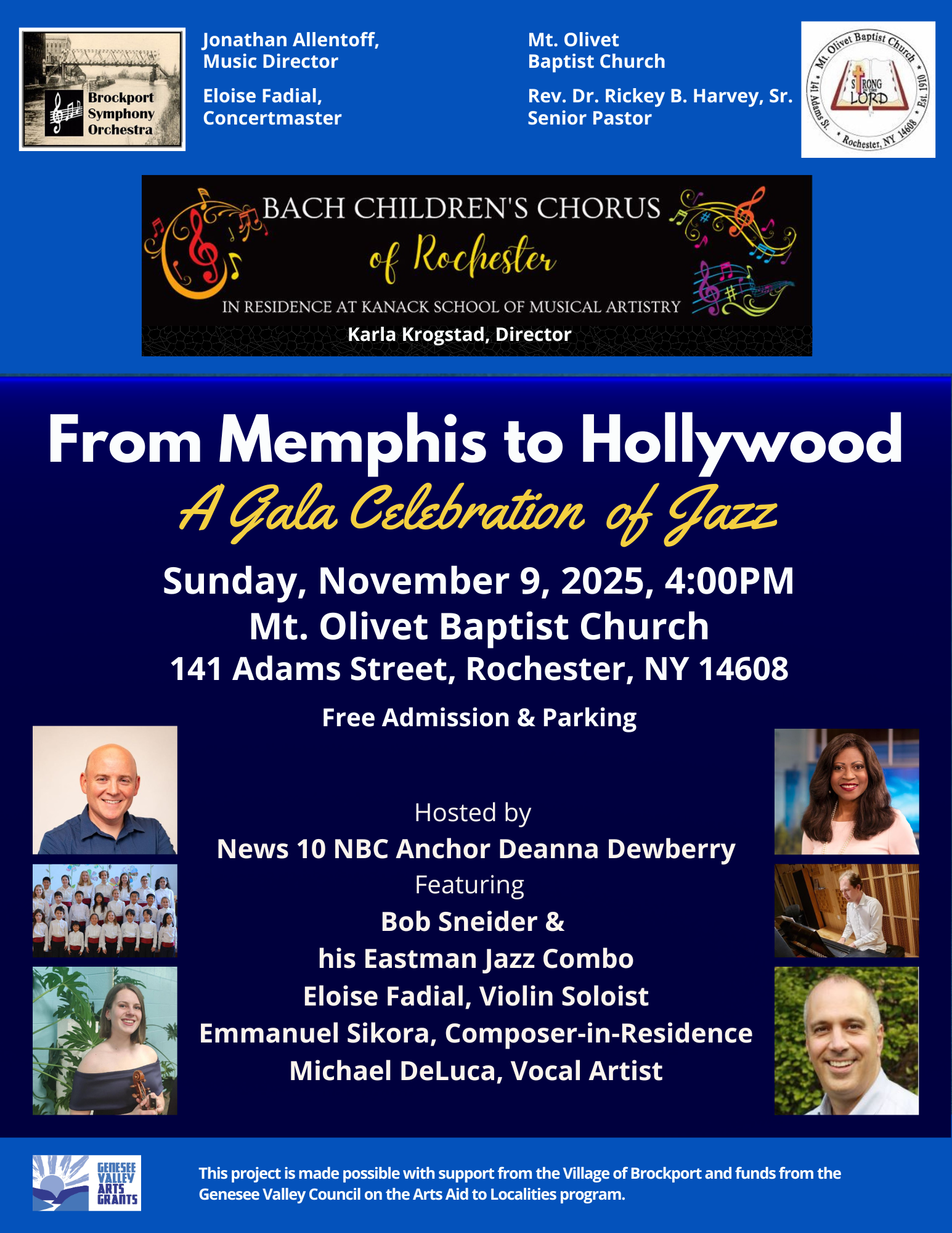 The fall concert, “From Memphis to Hollywood: A Gala Celebration of Jazz,” will be presented on Sunday, November 9, at 4 p.m. at Mt. Olivet Baptist Church, 141 Adams Street, Rochester. Hosted by Mt. Olivet Baptist Church and Rev. Dr. Rickey B. Harvey, Sr., Senior Pastor, this concert features the Brockport Symphony Orchestra directed by Jonathan Allentoff, the Bach Children’s Chorus directed by Karla Krogstad, Bob Sneider and his Eastman Jazz Combo, News 10 NBC Anchor Deanna Dewberry, violin soloist Eloise Fadial, composer-in-residence Emmanuel Sikora, and vocal artist Michael DeLuca.