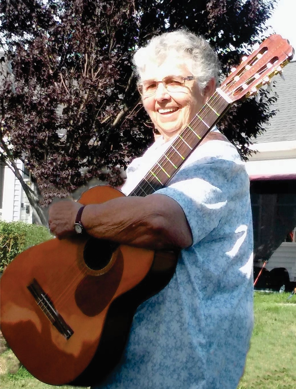 Joyce’s memories were filled with all the horses she tended and the parades, and riding lessons she gave children at her home and at neighborhood festivals. She was a 4H leader for many years. She loved gardening and kept a special photo album of her prized irises and lilacs to show anytime she had a visitor. She spent 40 years as a member of the Fox Den country music group, playing guitar and singing to her heart’s content. For over 30 years, this group played for church services at Hilton East Assisted Living. Joyce used to say the Fox Den played for “the old folks” there (she was well in her 80s at the time). It was fitting that she spent two years in residence there herself before becoming more frail.