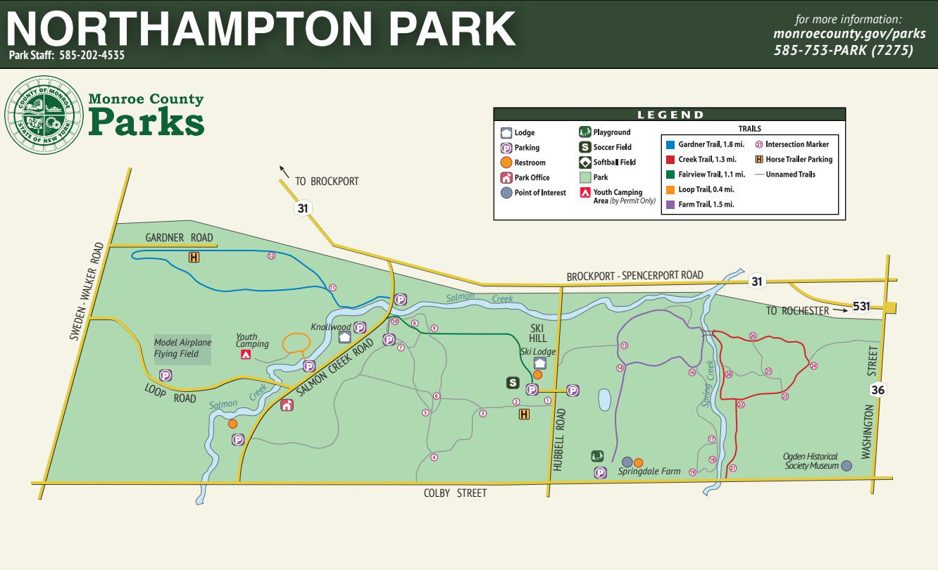 Northampton Park is an all-season park located in Brockport. This 900+ acre park offers trails for hiking and horseback riding, a model airplane flying field, a natural playground, soccer fields, downhill skiing, and snowshoeing. There are two enclosed lodges for rental and picnic tables for general use. Springdale Farm is located within the park and is operated by Heritage Christina Services. Springdale Farm is an agricultural education facility open to the public for visits.
