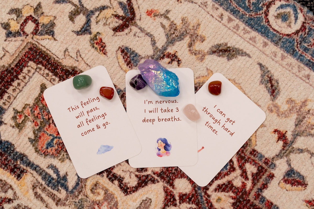 The room is equipped with storage for religious texts, yoga mats, a tabletop water fountain, chakra crystals, affirmation cards, and room dividers to support the practice of diverse faith and wellness traditions.