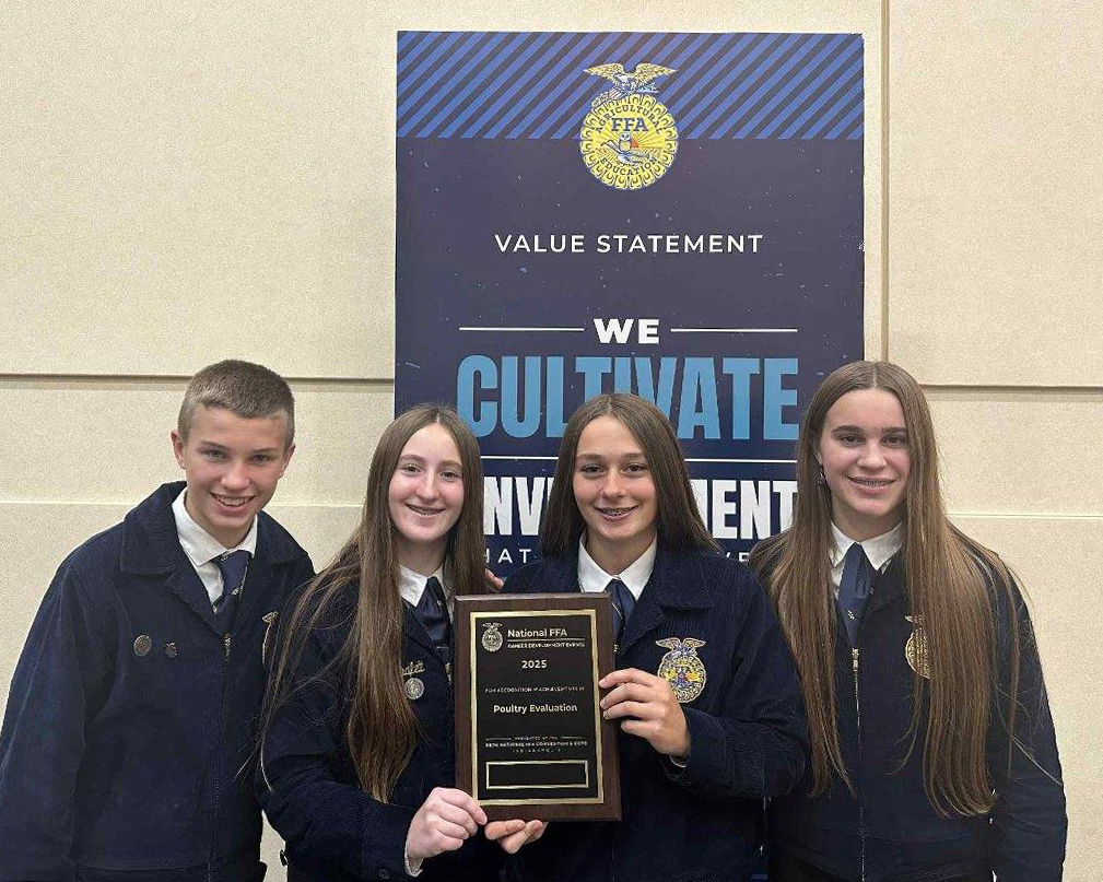 While at the National Convention, the team of Grant Kuipers, Ruth Kuipers, Taylor Lundfelt, and Brook Pagels represented NYFFA in the Poultry Evaluation contest, in which they evaluated live poultry, carcasses, and eggs, identified poultry parts, and completed a written exam. The team earned a bronze award. All the FFA members also had the opportunity to visit the FFA Career Expo, which featured new technologies and educational opportunities from numerous vendors, educational institutions, and the US military.
