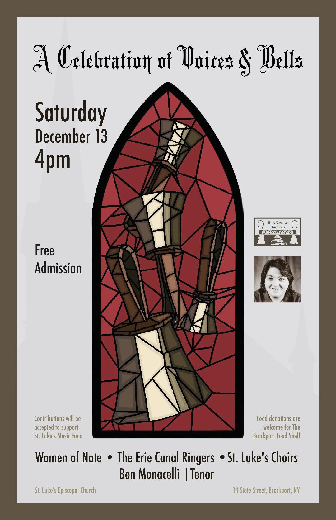 Ring in the holiday season with A Celebration of Voices and Bells, a free community concert on Saturday, December 13, at St. Luke’s Church, 14 State Street, Brockport. Doors open at 3:30 p.m. – arrive early for the best seats.