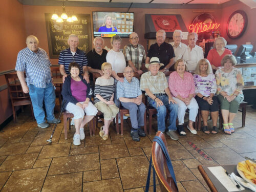 Members of the Holley High School Class of 1957 recently gathered for a reunion at 58 Main Restaurant in Brockport, as they have for the past several years. The class first came together for their 10-year reunion, which was held at the Village Inn in Gaines. From the 10th to the 50th, reunions were held at five-year intervals. Those who are able have attended yearly reunions since, some class members accompanied by their spouses or other guests. In attendance were (denotes class member): standing (l-r) – Tom Friedo, Jerry McAllister, Fran McAllister, Amy Ashbery, Tom McAllister, Jack Moore Jr., Lynn Van Orden, Nancy (McCarty) Hansen, Pat (Ellis) Baker; seated – Karen McAllister, Jeanne McAllister, Richard Ashberry, Dick Howard (Class Vice President), Bev (Lane) Brennan, Joyce (Sherwood) Bell, Carol (Persia) Olson*. Class members not attending because of distance and/or health are: Julianna (Rinas) Youngs, Anita (Lusk) Trupo, Marian (Mower) Moore, Fred Fiorito, Class President Robert Lacey, and George Noble.
