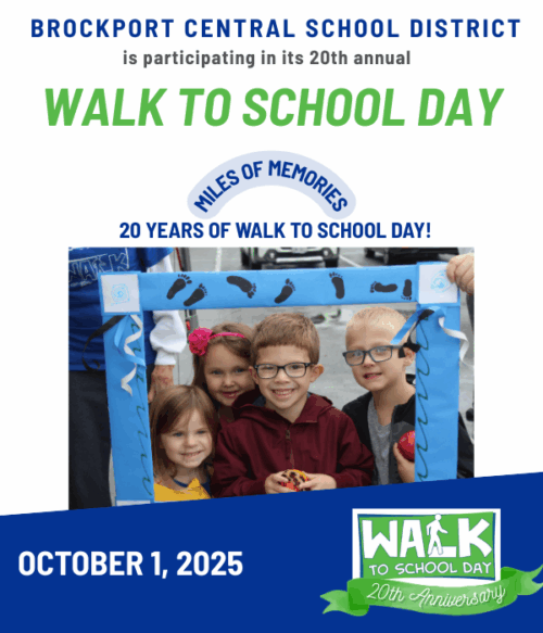 The Brockport Central School District will host its 20th Annual Walk to School Day on October 1, with this year’s theme: Miles of Memories: 20 Years of Walk to School Day.