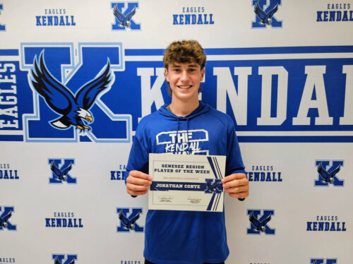 Kendall goaltender Jonny Conte was recently named Genesee Region Player of the Week for boys soccer. Jonny had a 3-0 record on the week while allowing zero goals on 11 saves.