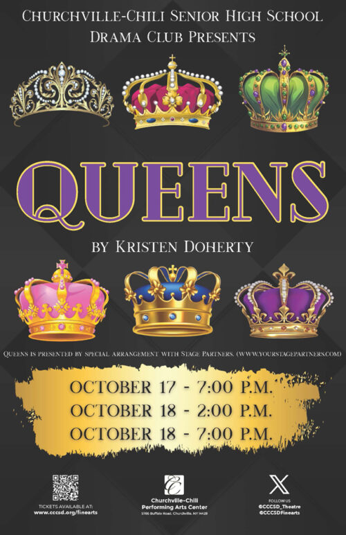Churchville-Chili High School will bring the stage to life this fall with “Queens,” a one-act play by Kristen Doherty. Performances are scheduled for: Friday, October 17 at 7 p.m.; Saturday, October 18 at 2 p.m.; and Saturday, October 18 at 7 p.m.