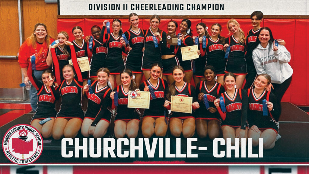 The Churchville-Chili Saints won the Division II title at the Monroe County Cheerleading Championships. The team is coached by Christine Kocher.